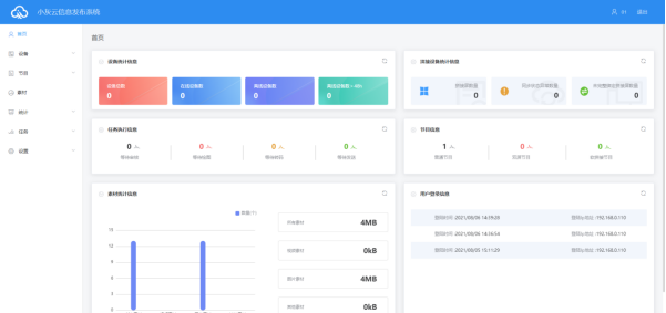 系統(tǒng)模塊LCD小灰云信息發(fā)布系統(tǒng)采用B/S系統(tǒng)架構(gòu),含有首頁、設(shè)備、節(jié)目、素材、統(tǒng)計(jì)、任務(wù)和設(shè)置模塊。圖1-1系統(tǒng)管理模塊?登陸界面:用戶登陸、切換語言等。?首頁:設(shè)備統(tǒng)計(jì)信息、拼接設(shè)備統(tǒng)計(jì)信息、任務(wù)執(zhí)行信息、節(jié)目信息、素材統(tǒng)計(jì)信息、用戶登錄信息。?設(shè)備:設(shè)備分組、設(shè)備上/下線狀態(tài)、時(shí)間校正、亮度調(diào)整、固件升級(jí)等操作,設(shè)備“詳情”中可以看到設(shè)備運(yùn)行狀態(tài)信息、節(jié)目信息、發(fā)布記錄和上下線記錄等。?節(jié)目:包含單個(gè)節(jié)目和節(jié)目單設(shè)置,新建節(jié)目、節(jié)目編輯、節(jié)目預(yù)覽、節(jié)目發(fā)布等操作。節(jié)目列表中可查看節(jié)目“發(fā)布記錄”、播控設(shè)置和GPS定點(diǎn)播放等。?素材:上傳視頻、圖片、GIF動(dòng)畫、Word、PPT、表格、待審...