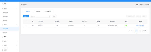 點(diǎn)擊【節(jié)目】,進(jìn)入到節(jié)目列表,可對(duì)節(jié)目重命名、預(yù)覽、編輯、復(fù)制、發(fā)布、歷史記錄、節(jié)目創(chuàng)建者、修改時(shí)間等操作,如果節(jié)目比較多,可以在節(jié)目名稱后面的文本框輸入關(guān)鍵字,點(diǎn)擊“查詢”按鈕即可,圖3-1。圖3-1節(jié)目列表?ID:節(jié)目的ID;?節(jié)目類型:創(chuàng)建節(jié)目時(shí)選擇的設(shè)備類型;?節(jié)目名稱:創(chuàng)建節(jié)目的名稱;?分辨率:創(chuàng)建節(jié)目的模擬顯示屏的大小;?時(shí)長(zhǎng):節(jié)目總時(shí)長(zhǎng);?創(chuàng)建者:創(chuàng)建節(jié)目的用戶名稱;?修改時(shí)間:最后編輯節(jié)目的時(shí)間;?狀態(tài):如果節(jié)目?jī)?nèi)容沒有暴力恐怖、色情違法或敏感詞匯,則為綠色圖標(biāo),AI一般可以審核通過;否則為紅色,需要人工再審核才能通過;?操作項(xiàng):可對(duì)節(jié)目預(yù)覽、編輯、重命名、GPS定點(diǎn)播放、播控...